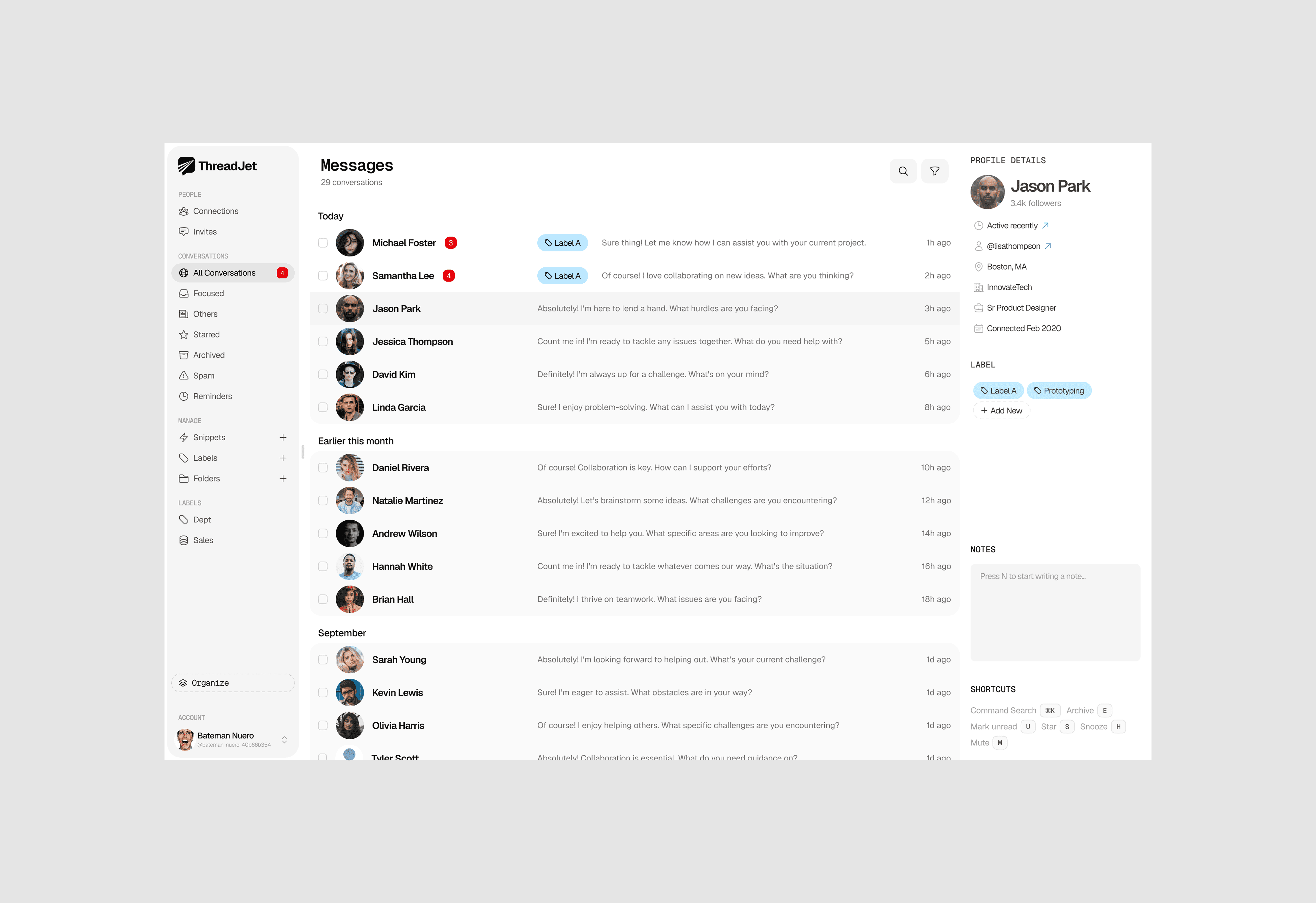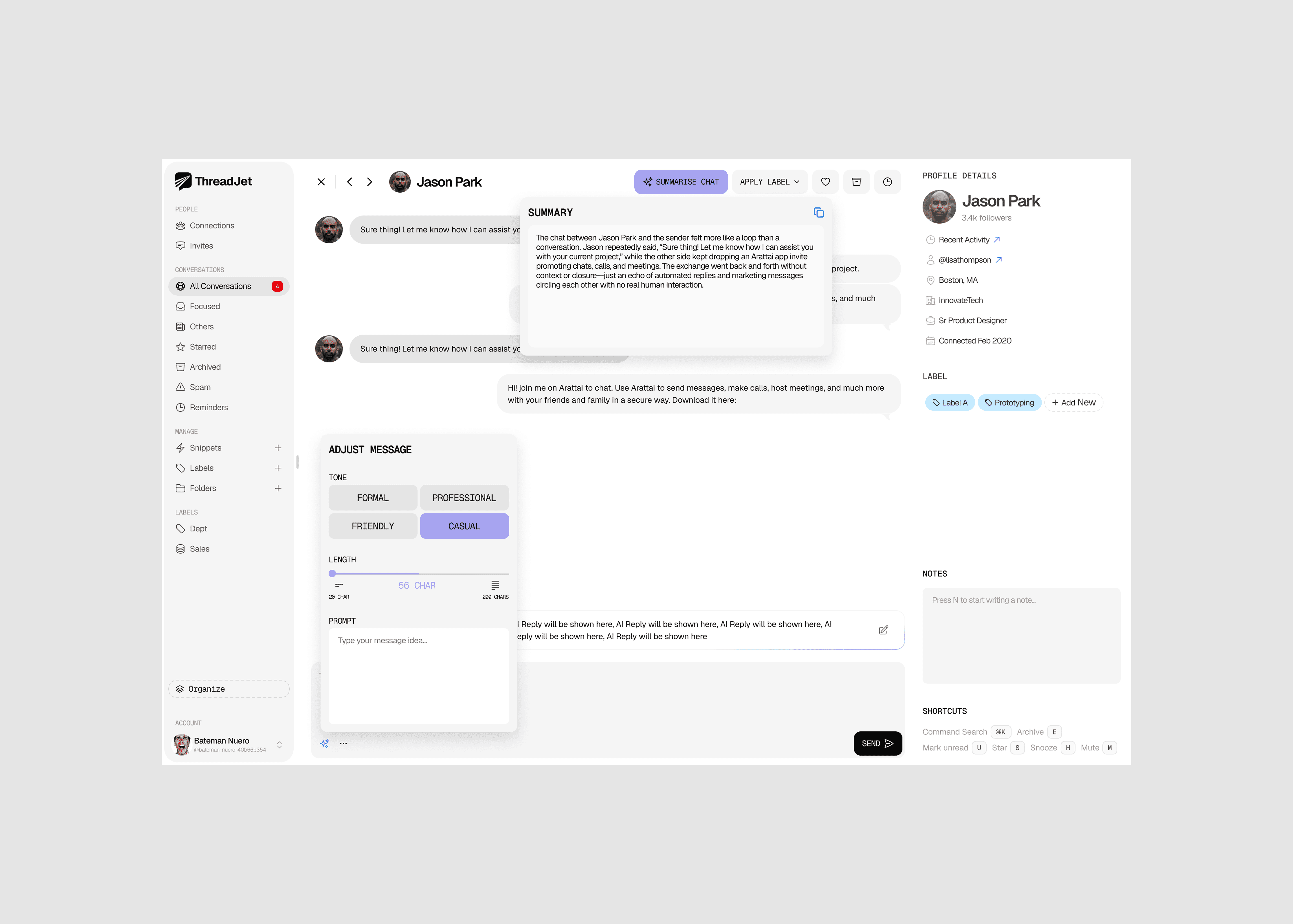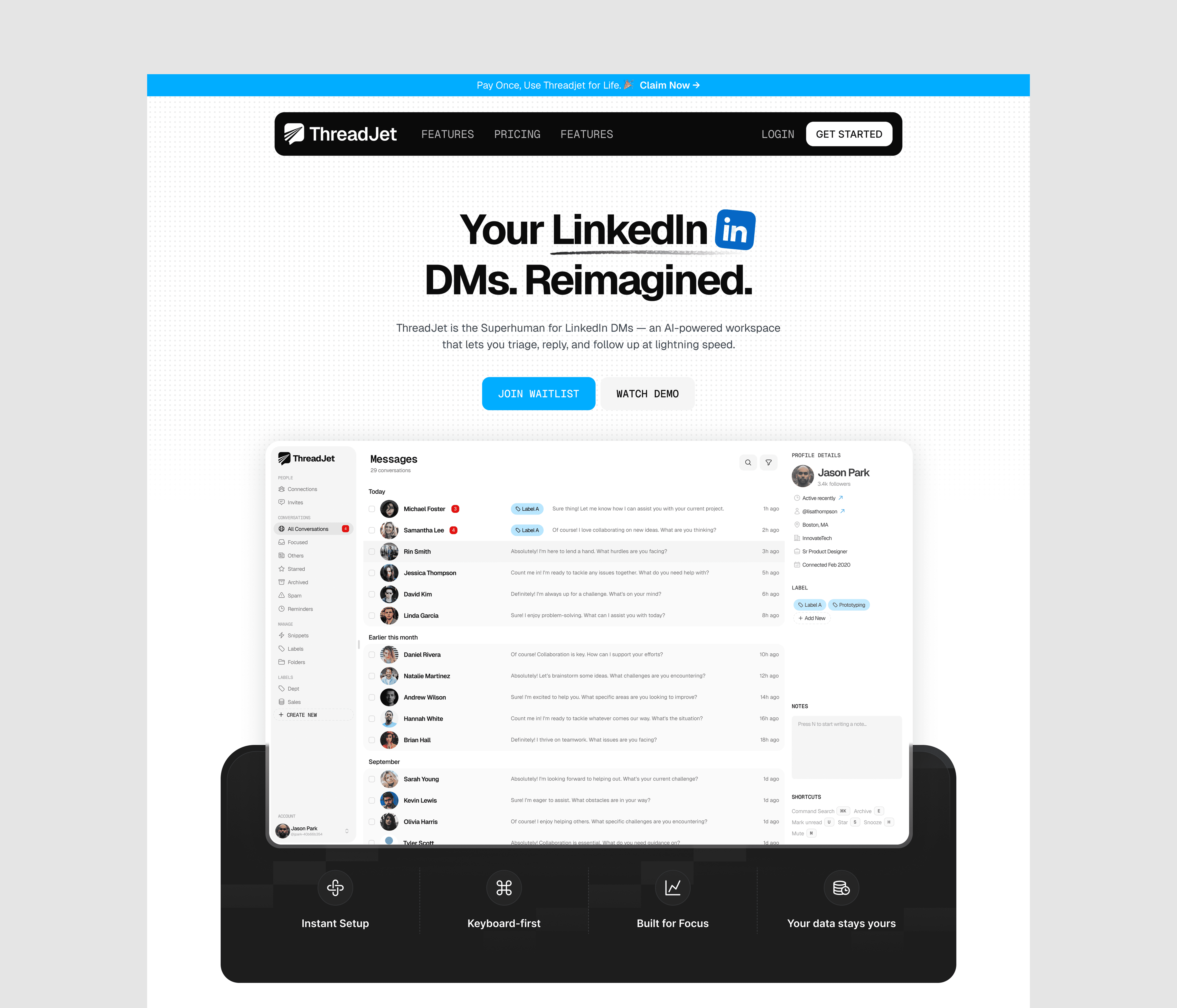 Led ThreadJet from idea to execution mapping every workflow, defining information architecture, and engineering conversion funnels grounded in our core values of speed, shortcuts, focus, and privacy. I reimagined LinkedIn messaging without breaking native patterns, designing a keyboard-first, AI-assisted flow that compresses time-to-reply and scales DM throughput. I shipped a cohesive design system, performance-first UI, and compliant data practices, and produced marketing assets for growth and socials to drive awareness, activation, and retention.