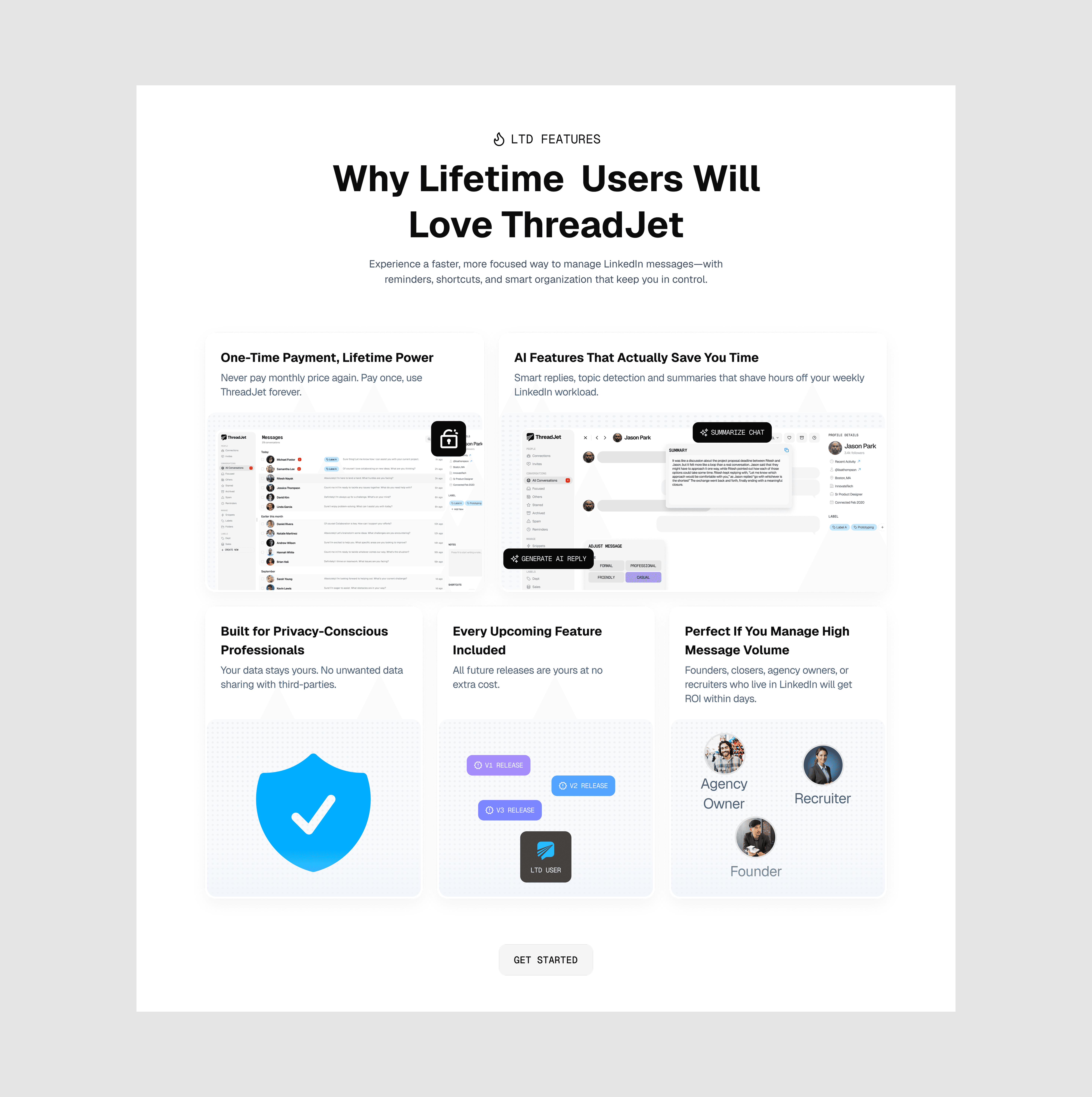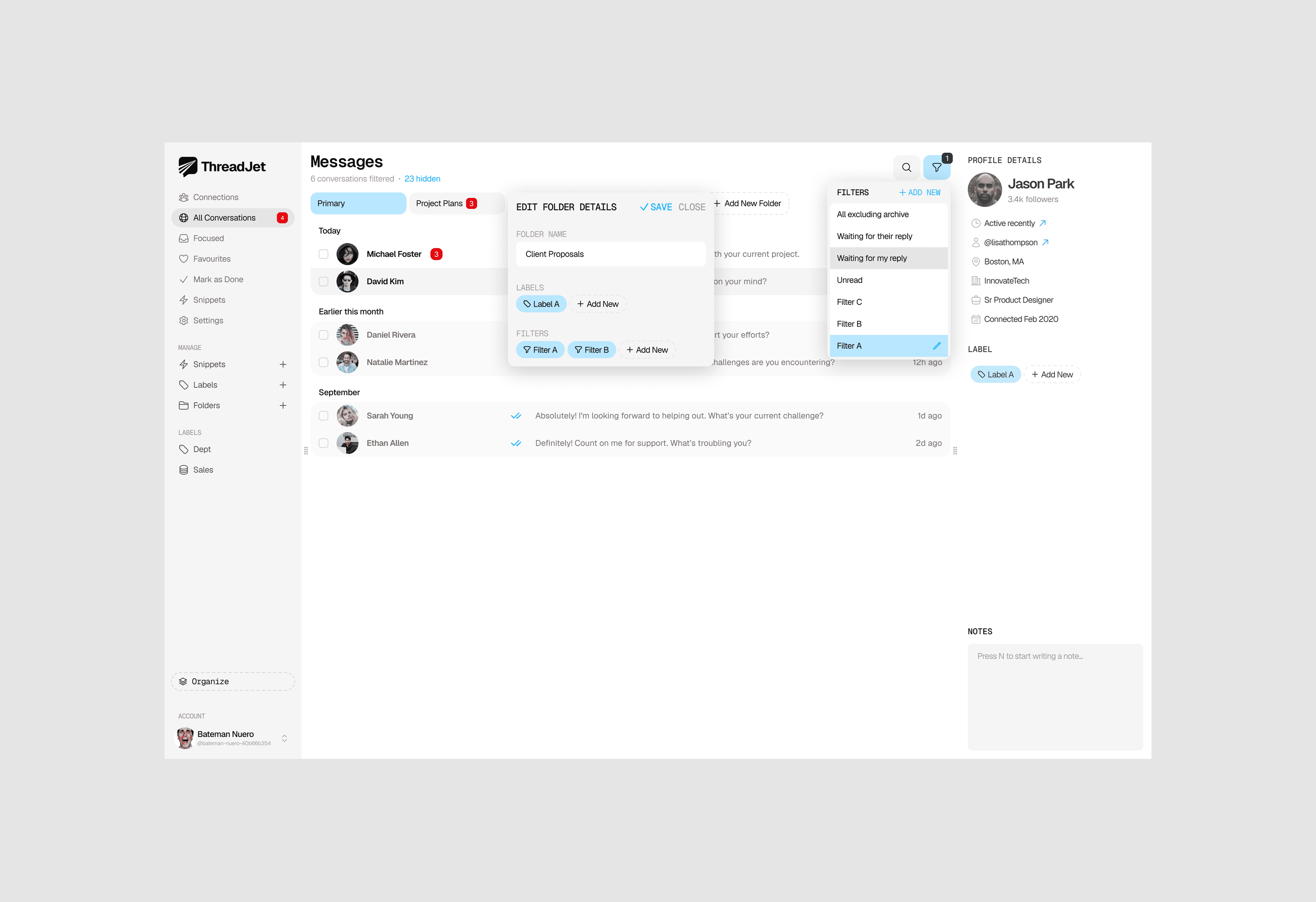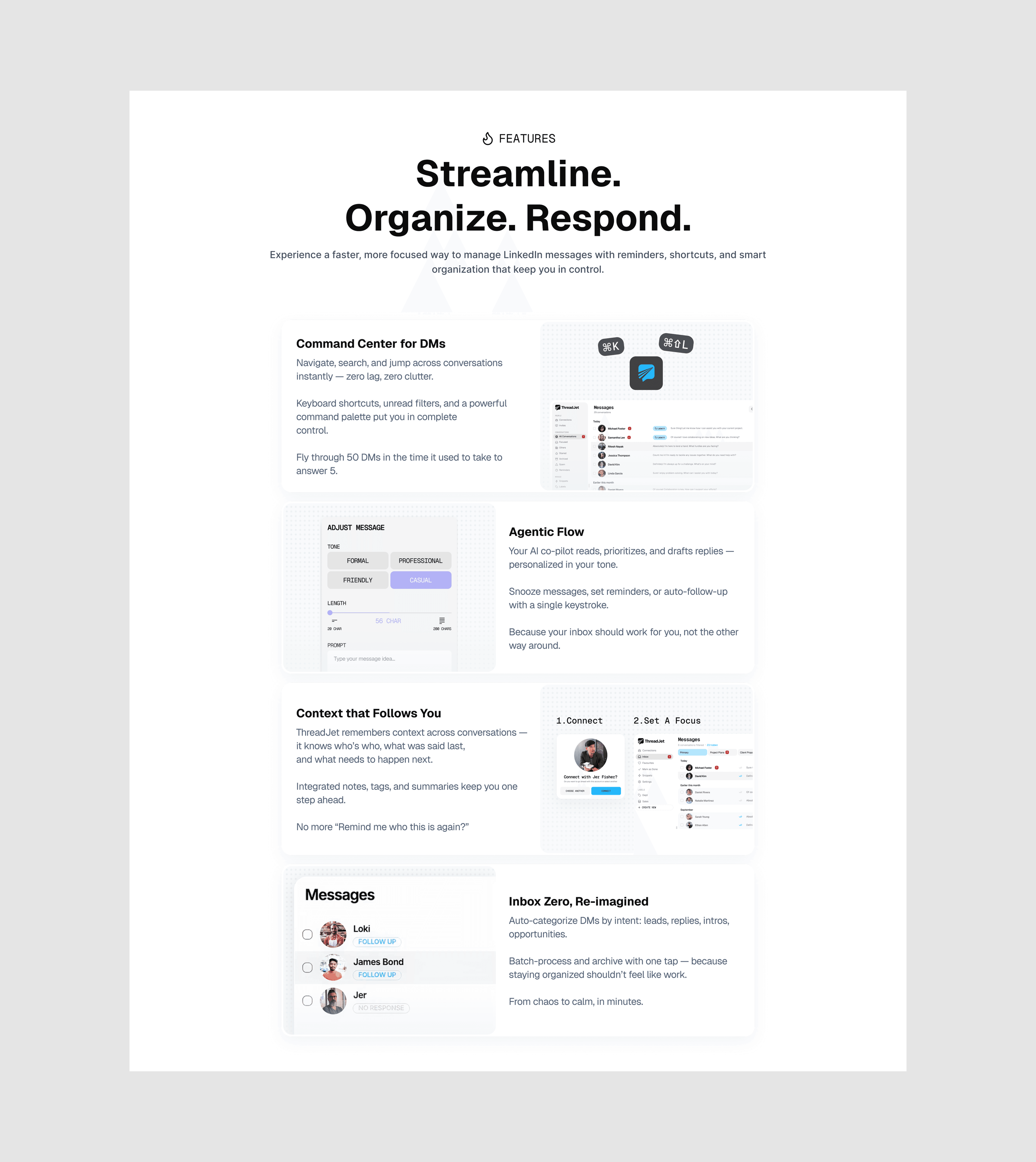Led ThreadJet from idea to execution mapping every workflow, defining information architecture, and engineering conversion funnels grounded in our core values of speed, shortcuts, focus, and privacy. I reimagined LinkedIn messaging without breaking native patterns, designing a keyboard-first, AI-assisted flow that compresses time-to-reply and scales DM throughput. I shipped a cohesive design system, performance-first UI, and compliant data practices, and produced marketing assets for growth and socials to drive awareness, activation, and retention.